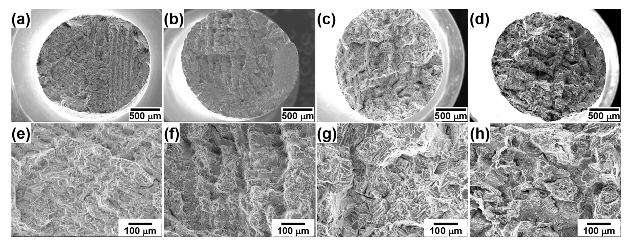 SEM images of fractured tensile specimens surface (a), (e) Airfoil (25 °C), (b),
