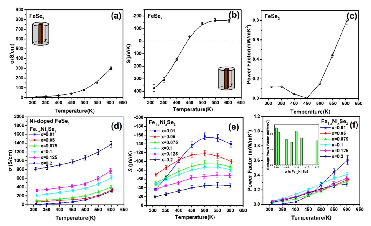 calculated over the entire temperature range are also shown in the inset of Fig 2(f). The average power factor had a maximum value at x = 0.1, except for undoped FeSe2, which exhibited a bipolar effect.