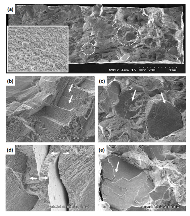 하단)이 분포하고 있어 인장강도에 도달한 이후 입내 연성파괴가 진행되었음을 알 수 있다. 다만, 그림 13 (a)의 원으로 표시한 부분을 확대하여 나타낸 것처럼 딤플이 있는 계단 또는 선반 형태의 평평한 면들이 미끄러지고(그림 13 (b)), 특정 결정면이 전단(그림 13 (c))되는 형상도 일부 영역에서 관찰되었다. 이러한 국부적인 취성파괴 형상은 800°C에서도 유사하게 나타났으며(그림 13 (d), (e)), 인장방향과 각을 이루고 있는 경우 미끄러지거나 뒤틀리는 형태를, 수직한 경우 전단 또는 뜯김 형태를 보였다.
