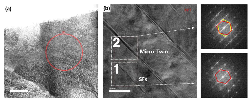 여러 선이 관찰되었으며 (그림 14 (a)의 원 부분), FFT(Fast fourier transform) 분석을 통해 미세 트윈임을 확인하였다. 그림 14 (b)에 나타낸 바와 같이 SFs는 매우 작은 두께로 인해 만들어지는 streak 이미지만 나타나는 반면, 미세 트윈은 streak 이미지와 이중회절패턴