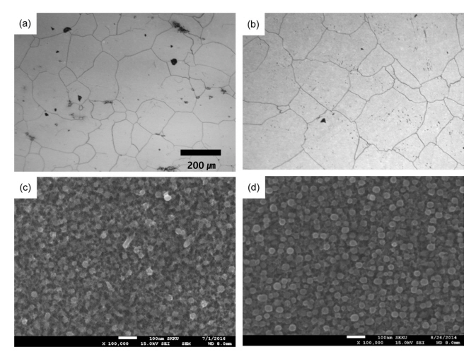 DM2700 M) 및 주사전자현미경(JEOL JSM-7600F field-emission gun with EDS)을 이용하여 결정립과 입계에 분포하고