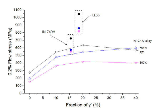 η 상이 생성되지 않는 범위에서 γ' 생성 원소인 Ti와 Al의 비율을 1:1로 하면서 최대(1.5%)로 첨가한[21] 결과, Ti와 Al을 1.35% 첨가한 740H 합금의 γ' 분율 15.5% 대비 LESS 합금의 γ' 분율이 18.5% 로 다소 높게 생성되었다.