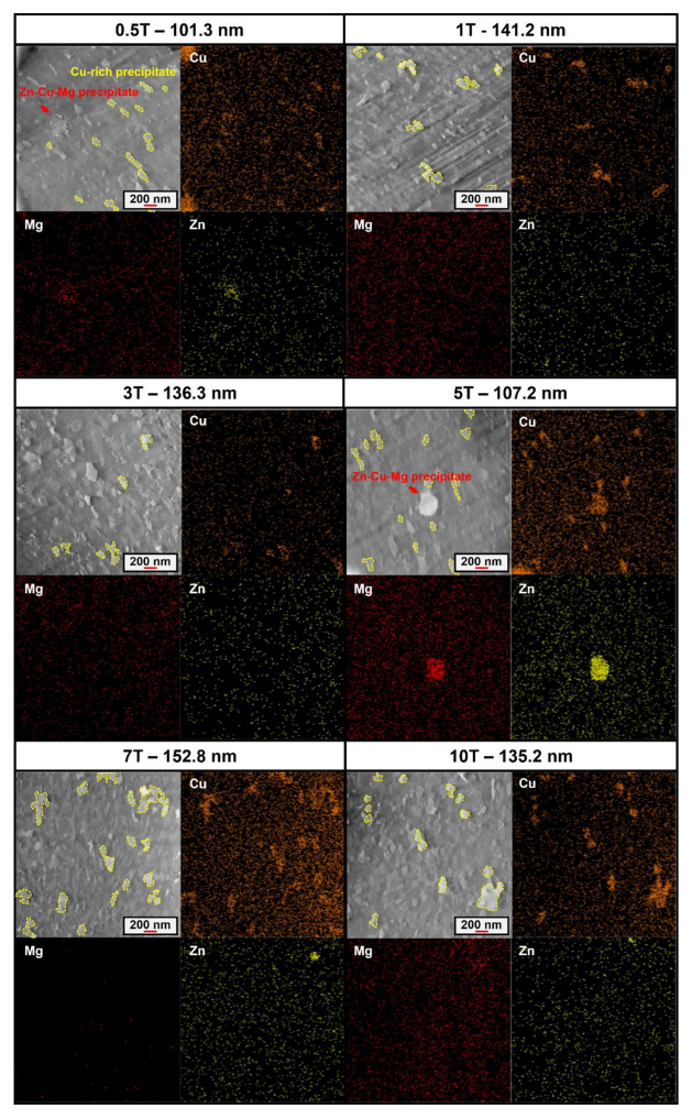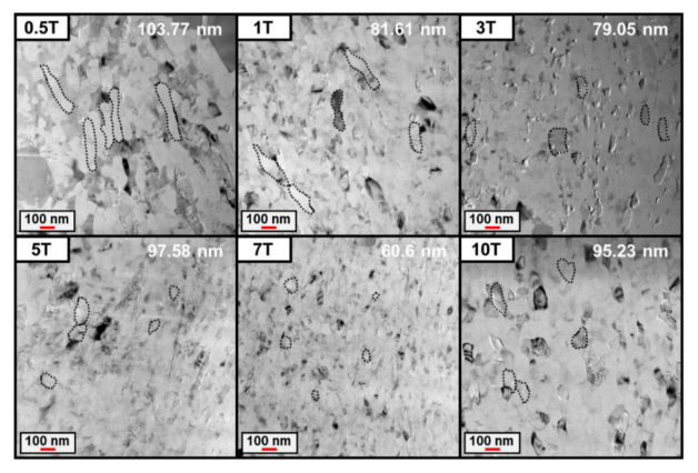 석출물의 점진적인 성장이 발생하면서 10T에서는 140 nm까지 다시 증가함을 확인할 수 있다. 본 현상에 의해 5T 이전과 7T 이후에서의 기계적
