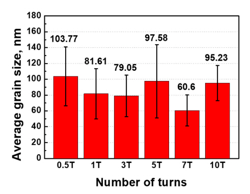 미세한 등축 결정립들이 관찰됨을 확인할 수 있다[24]. 두번째로, 7T 이상의 높은 회전수에서는 변형이 증가함에 따라 결정립 크기가 95.3 nm까지 증가하는 현상이 발생하는데, 이는 축적된 전위가