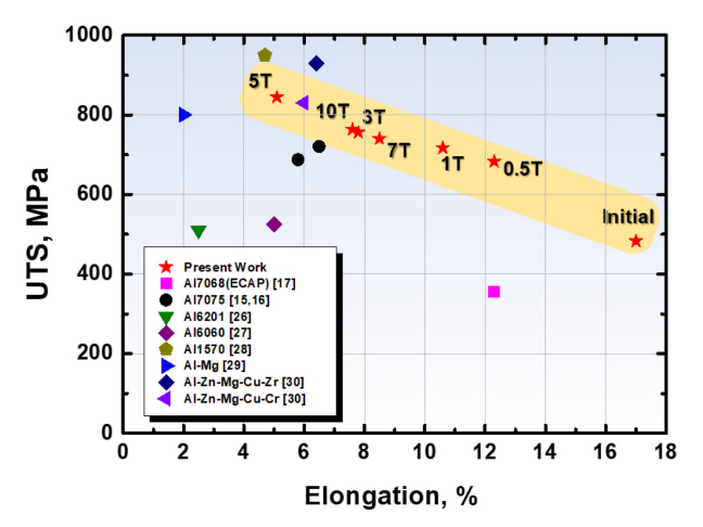 변화는 trade-off 관계를 가지는 것을 확인할 수 있는데 변형 초기 단계(~5T)에서는 인장강도의 증가에 따라 연신율이 감소하고 변형 후기 단계(7T~)에서