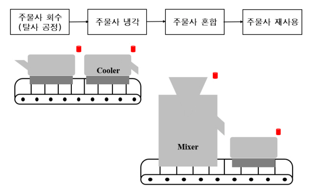 처리공정을 거치게 된다. 회수된 주물사는 냉각시켜 온도를 낮춘 후 주물사 성분을 균질하게 섞어주고 모래 표면에 벤토나이트를 잘 도포되도록 혼합시키는