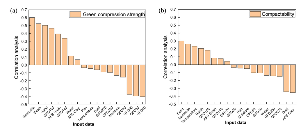compression strength and input variable, (b) correlation between compactability and