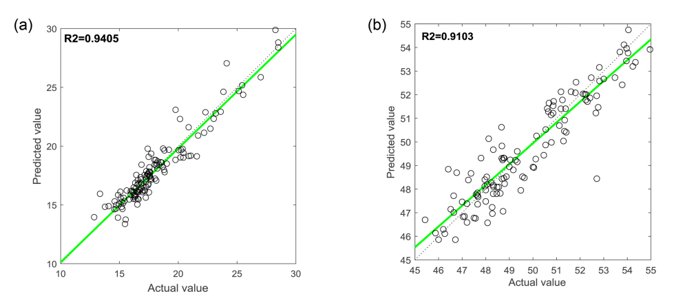 reduced model (a) green compression strength prediction model, (b) compactability