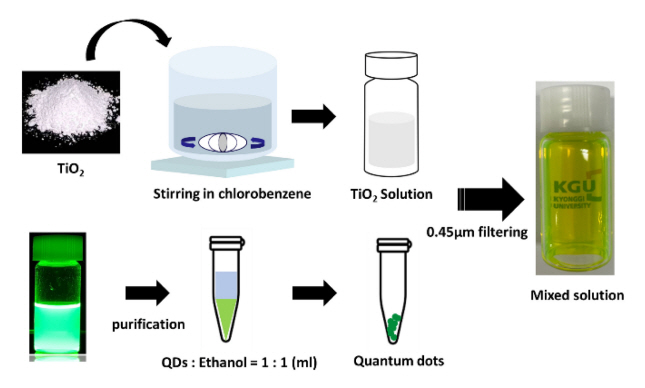 IPA의 혼합 용매에 100 °C에서 1시간 stirring해 준 후, 13000 rpm의 centrifugation을 통해 TiO2 NPs를 얻을 수 있다. EML로 사용될 TiO2 NPs과 녹색 QDs의 혼합 용액은 chlorobenzene에 준비되었으며, 그 과정은 그림1에 간략히 설명되었다.