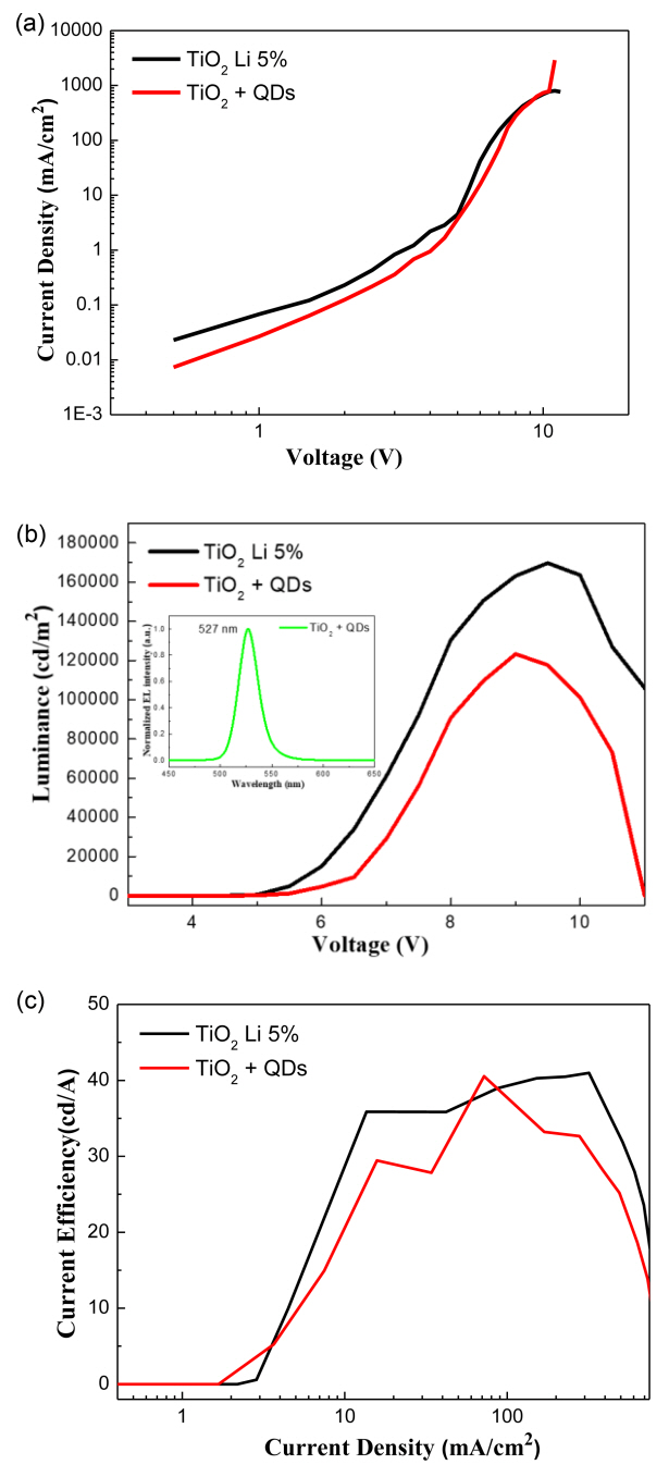 에너지밴드 모식도에 사용된 TiO2의 밴드갭, CBM, valence band maximum (VBM) 값은 이전 연구결과에서 참고하였으며[13], 하부 전극 ITO를 음극으로 사용하는 역구조이다. ITO를 통해 주입된 전자는 TiO2과 QDs의 혼합층으로 이동하며, 상부전극을 통해 주입된 정공은 HIL 역할을 하는 MoO3, HTL 역할을 하는 CBP 층을 지나 발광층으로 이동한다. TiO2과 QDs의 CBM이 비슷한 값을 가지기 때문에 전자의 이동이 잘 이루어지며, TiO2의 낮은 VBM은 정공이 발광층 영역에 머물도록 도와준다.