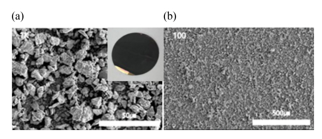 통해 30분간 초음파 처리를 해주어 용액 내의 입자들을 잘 분산되게 하고, 좀 더 미세하고 균일한 크기로 파쇄시켜주어 그림 1(a)와 같이 AC EPD를 진행하였을 때 current collector 위에 그림 1(b)의 MAX (Ti3AlC2) phase 입자들이 고르고 균일한 박막을 형성할 수 있도록 하였다.