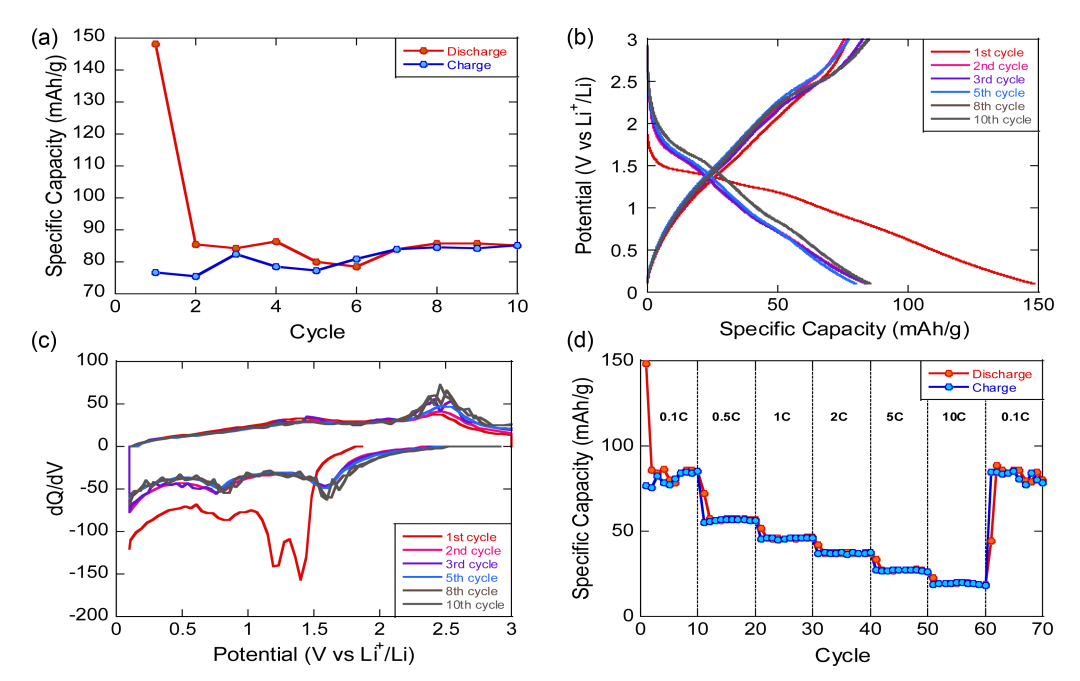 window between 0.1 and 3.0V. (c) Plot of dQ/dV at 0.1C-rate. (d) Specific capacity
