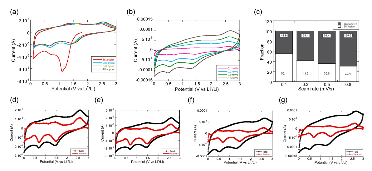 식(1)에서 a와 b값은 조정 가능한 매개변수로, 일반적으로 Li이온 확산을 포함하는 활물질의 전하 저장 변수들을 나타낸다. k1은 non-faradaic (surface capacitive component) 전류 비율을, k2는 faradaic (diffusive component) 전류 비율을 나타내고, b 값은 이에 대한 기여도를 나타낸다. 그림 5(c)에서 정량화된 faradaic, non-faradaic 성분들의 기여도는 그림 5(d), (e), (f), (g)의 각 scan rate별 CV 커브를 식(1)을 통해 산출한 것으로서, scan rate가 0.1mV/s에서 0.8mV/s로 증가함에 따라 faradaic