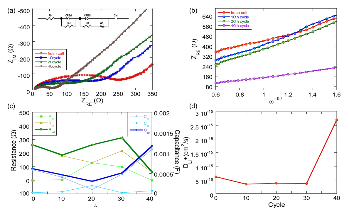 (a) Nyquist plots of MAX(Ti3AlC2) electrode at each cycle. (b) Z’ plotted against ω-0.5 at low frequency. (c) Resistance and capacitance at each cycle. (d) Diffusion coefficient