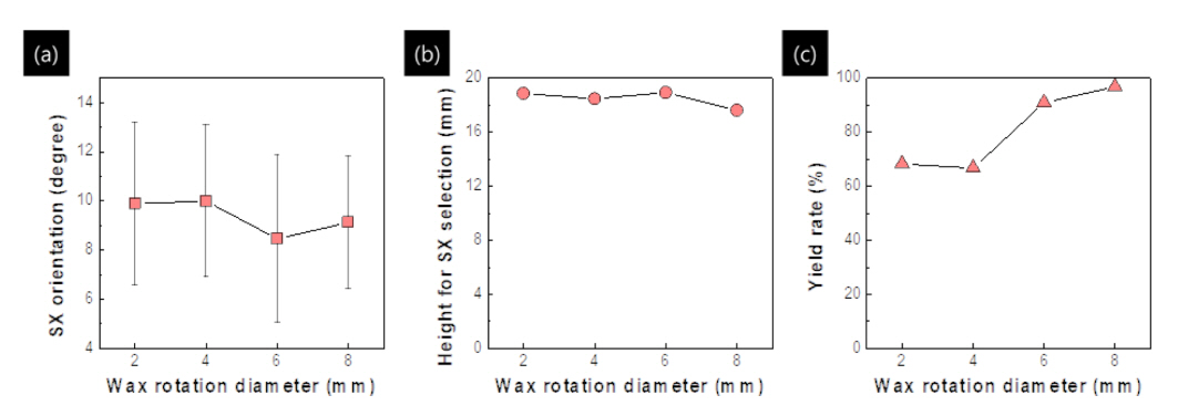 그림 3-(b), (c)와 (d)는 각각 Spiral selector 내에서 일어나는 단결정 선택 과정에 대한 조직 사진 및 EBSD, 전산해석으로 예측된 자료이다. 해당 그림 3-(b), (c)에서 보이는 결과는 Seo 등[24]의 연구 결과와 같이 Spiral selector 내벽에 위치한 결정립이 최종 단결정으로 선택되는 결과를 확인할 수 있었다.