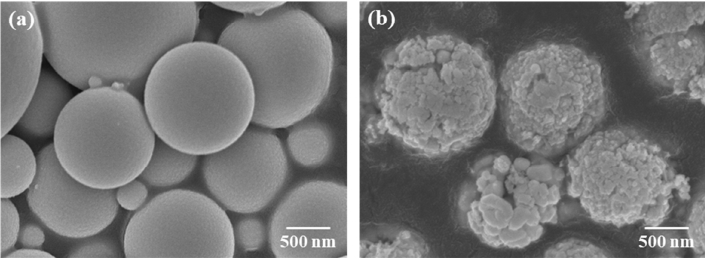 복합분말 합성방법에 따른 분말형상 특성을 분석하기 위해 USP 공정으로 합성한 WO3-Y2O3 분말과, USP 공정으로 W분말을 먼저 합성한 후 폴리머 용액공정으로 Y2O3를 첨가하여 하소한 분말을 SEM으로 관찰하였다. 그림 1(a)와 같이 USP로 동시에 복합분말을 합성한 경우는 구형의 분말이 얻어지며 1 μm 이하의 다양한 크기를 나타냄을 알 수 있다. USP/폴리머 용액공정으로