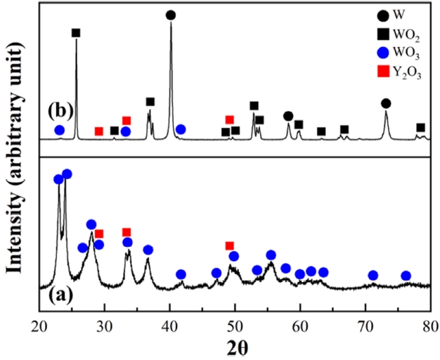 그림 2는 USP 공정 또는 USP/폴리머 용액공정의 결합으로 합성한 혼합분말의 XRD 분석결과이다. 그림 2(a)와 같이 USP로 합성한 분말에서는 WO3와 Y2O3 상의 피크만 관찰되나, 폴리머 용액공정이 결합된 경우는 그림 2(b)에서 보여주듯이 순수한 W과 함께 일부 W 산화물상이 관찰된다. 용액공정으로 합성한 복합분말에 존재하는 W 산화물은 환원된 W 분말에 Y-nitrate를
