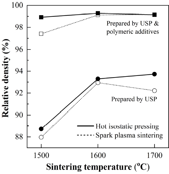 oC에서 2시간동안 HIP 처리를 하였다. 그림 4는 USP 공정 또는 USP/폴리머 용액공정으로 합성한 W-1 wt% Y2O3 복합분말의 소결조건에 따른 상대밀도 변화를 나타낸 것이다. 모든 시편에서 SPS의 온도가 증가함에 따라 상대밀도가 증가하는 경향을 나타내나, 1700
