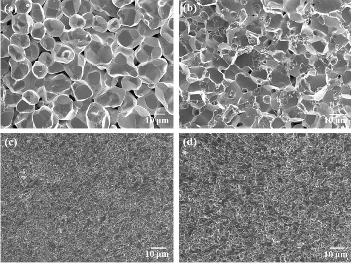 USP; (a) SPS at 1500oC and (b) HIP at 1650oC. Powder mixture prepared by USP with polymeric additive route; (c) SPS at 1500oC and (d) HIP at 1650oC.