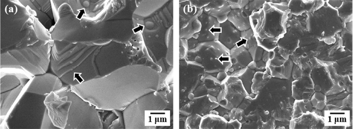 일반적으로 소결공정으로 제조한 복합재료에서의 기지상 입자크기는 첨가된 분산입자의 양과 크기에 의존하며[20], 본 연구와 같이 동일한 첨가량에서는 분산입자의 크기가 작을수록 소결체의 기지상 입자크기가 감소한다. 그림 6은 USP 1600 oC에서 SPS한 후 계속해서 HIP로 치밀화한 소결체의 파단면을 나타낸 것으로, 화살표로 표시한 것처럼 USP로 합성한 분말보다는 USP/폴리머 용액공정의