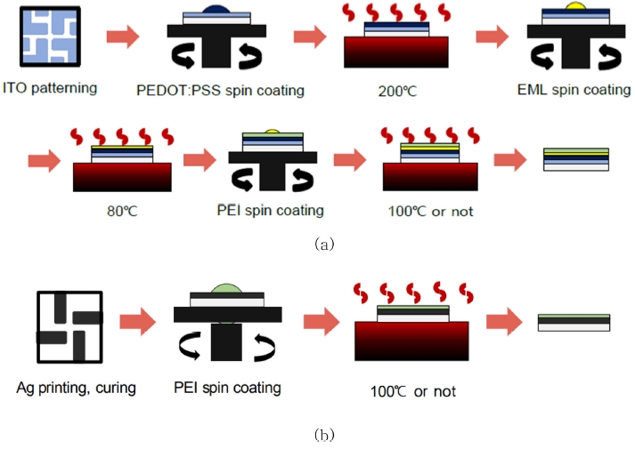 본 연구의 핵심이 되는 접착층이 갖춰야 하는 조건은 물리적인 접착력은 물론 이를 통하여 전하의 이동이 이루어져야 한다. 그림 2에서 스핀 코팅으로 코팅하는 3개의 코팅층인 PEDOT:PSS, EML, PEI 층이 그 후보가 될 수 있으므로 먼저 두 장의 유리 기판 사이에 이들을