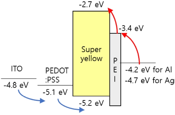 작으므로 수월할 것으로 예상되지만, 음극에서의 전자 주입은 PEI 의 일함수가 3.4 eV인데 비하여 알루미늄은 4.2 eV, 은 은 4.7 eV로서