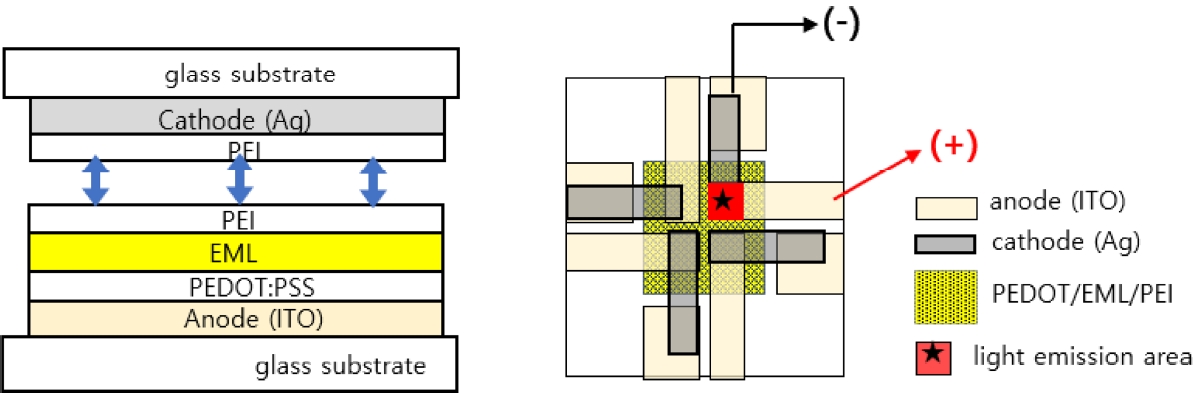 그림 2에서 제작한 양극 기판과 음극 기판을 접착층을 이용하여 접합소자를 제작하는 과정에 대하여 그 층의 구성과 전극 설계 개념을 그림 4에 나타냈다. 그림 4(a)에서 보듯이 그림 2에서 제작한 양극 기판과 음극 기판을 양쪽에 동일하게 코팅한 PEI층을 접합층으로 활용하여 접합하였고 이를 100 oC로 가열된 핫 플레이트 위에서 10분 동안 일정한 하중의 물체로 누르면서 열 압착하였다. 그림 2에서 양쪽 기판에 코팅한 접착층은 이를 통하여 소자의 접착력과 전하 이동도를 동시에 확보해야 하므로 접착층의 조성, 첨가제, 건조 방식 등의 여러