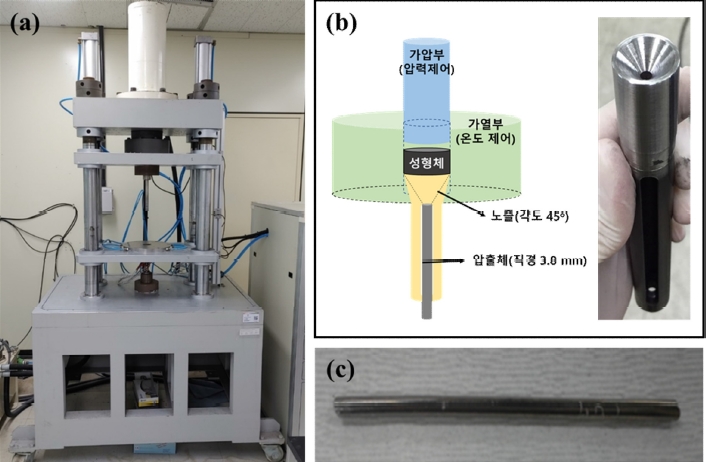 Photos of (a) hot extrusion machine, (b) die, and (c) hot extrudate. Schematic illustration
