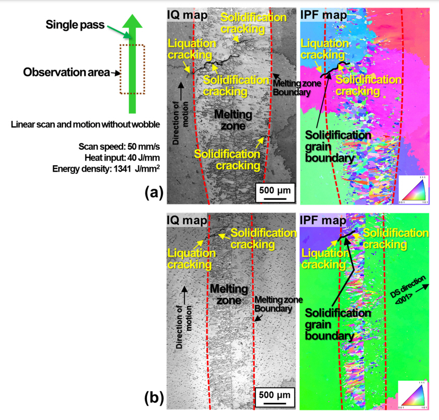 OM, EBSD images of single-pass laser melting (a) surface and (b) cross-section for
