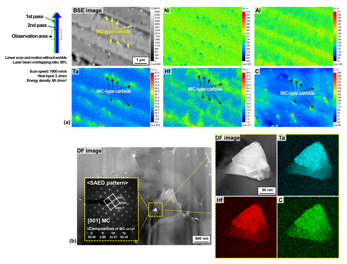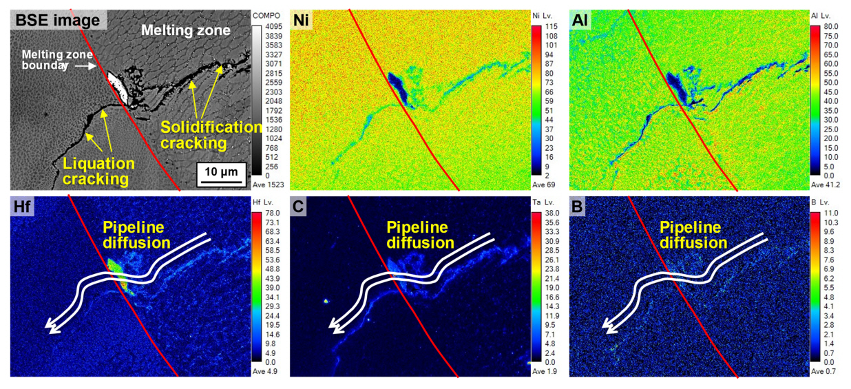 (a) element distribution of the melting zone and (b) phase characterization by EPMA