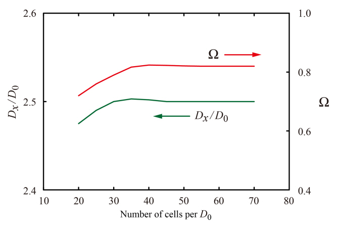 위해 바닥 표면 근처의 셀을 자체 적응적으로 조밀화 하였다. 속도장 및 압력장의 경우 정규화된 잔차(residuals)가 10-5보다 작게 설정되었고, 최대 내부반복(internal iteration) 및 시간 단계(time step)는 각각 시간 단계당 30회 및 1 μs로 설정되었다. 격자 독립성 시험(grid independence test)은 Appendix의 그림 A1에 제시되었다.