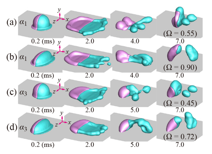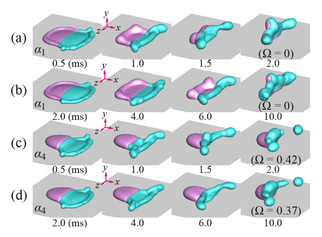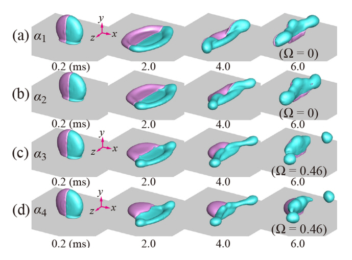 behavior of ellipsoidal Janus drops with α1 – α4, respectively, under Wew = 37, D0 = 1.97 mm, and e = 0.57.