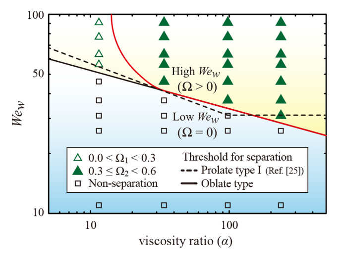 Regime map of the separation efficiency as a function of the viscosity ratio and Wew under Prolate type II. Rectangle and triangle symbols represent non-separation (low-Wew regime) and separation (high-Wew regime) cases between two fluidic parts, respectively. Solid and dashed lines indicate