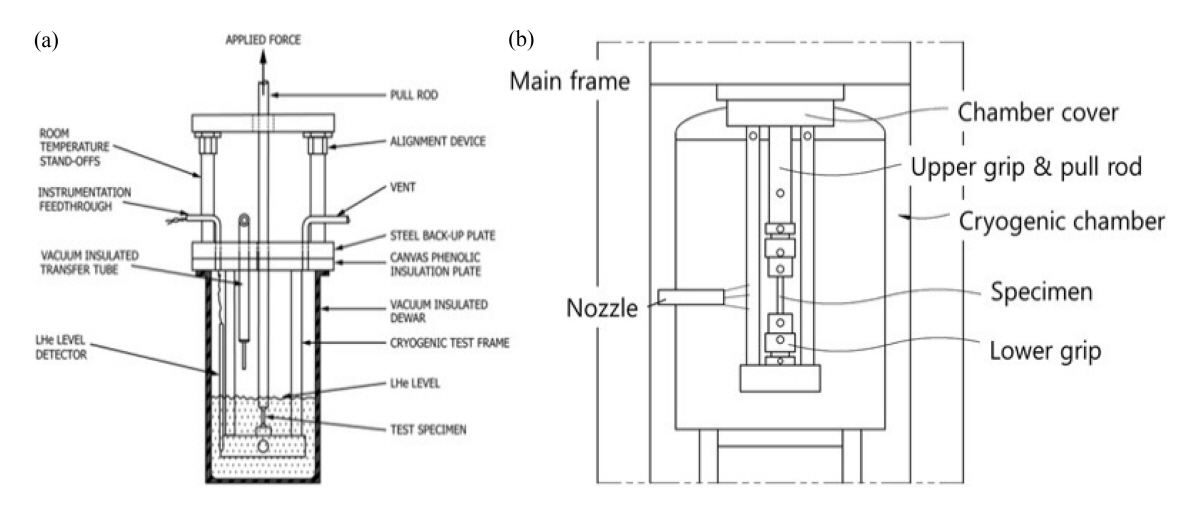 그림 1a는 미국 재료시험학회 표준 규격인 ASTM E1450에서 4 K 수준의 극저온 인장시험을 수행하기 위해 제시된 저온 유지 장치(cryostat)을