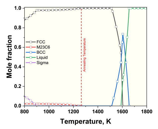 소프트웨어를 통해 평형 상 분율을 계산하였다 (그림 2). 이때, 열역학 데이터베이스의 경우 Fe-based alloys (TCFE9)을 활용하였다. 합금 설계 컨셉은 기본적으로 오스테나이트 안정화원소인