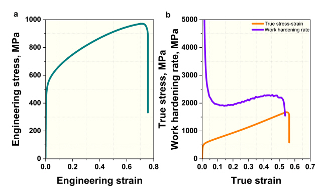 그림 5a는 본 소재의 상온 인장 시험 결과를 보여준다. 상온에서의 항복 강도는 447.4 MPa, 최대 인장 강도는 970.6 MPa, 그리고 연신율은 75.2%로