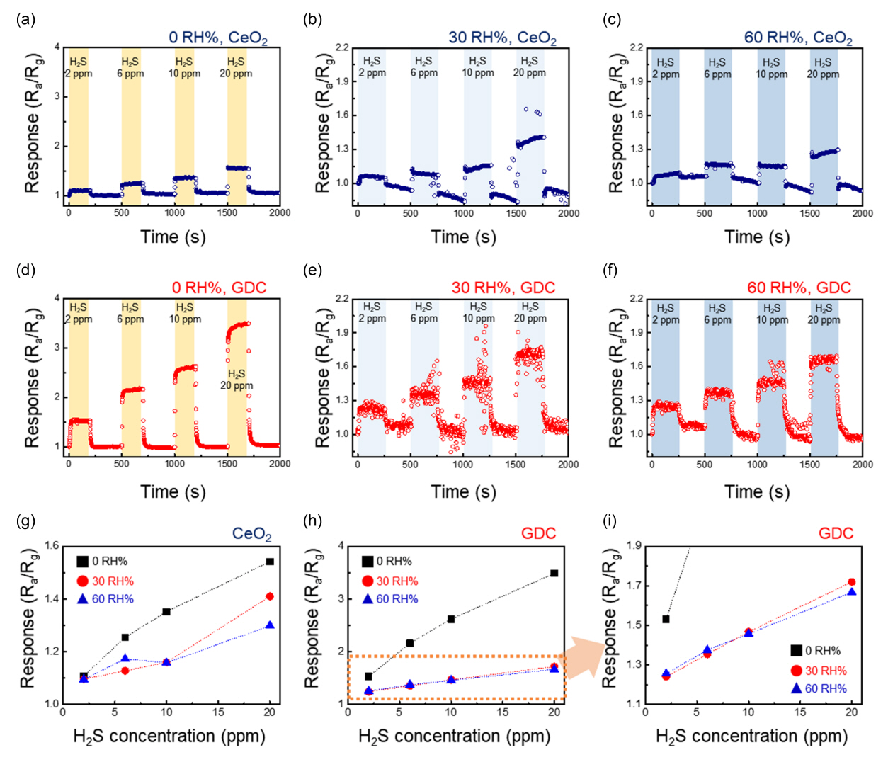 pristine CeO2, and (h) GDC gas sensors to H2S gas in the presence of various levels of humidity. (i) Enlarged view of indicated