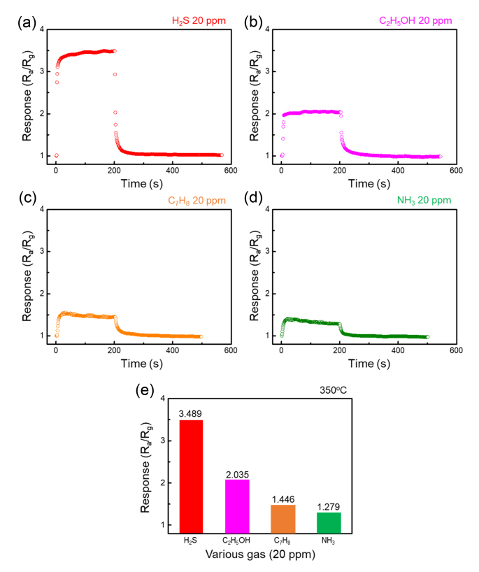 in Fig 5(e). The responses to 20 ppm H2S, C2H5OH, C7H8, and NH3 were 3.489, 2.035, 1.446, and 1.279, respectively. Hence, the response to H2S was more than that of the other gases, and the sensor showed selectivity towards