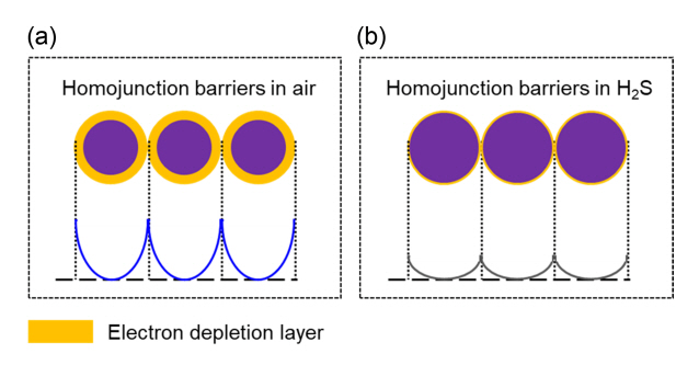 Formation of homojunction barriers: (a) in air and (b) in the presence of H2S gas.