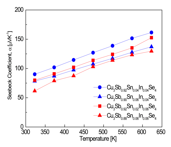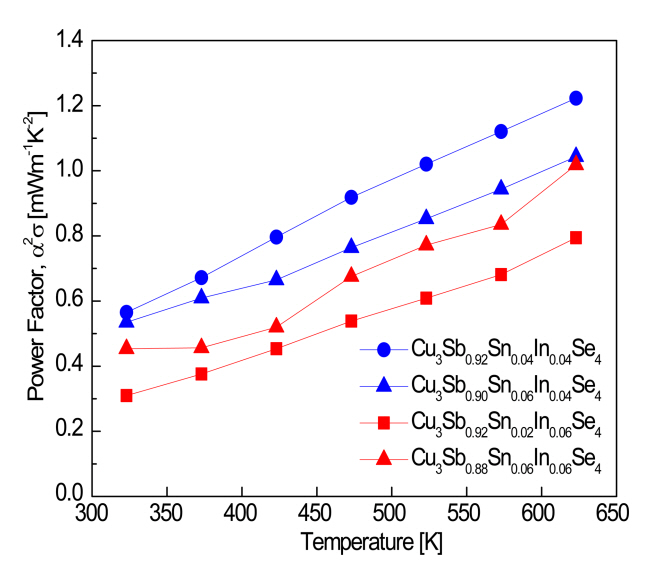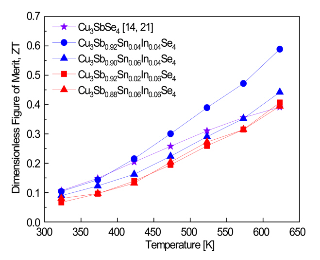 The Cu3Sb0.96−xSnxIn0.04Se4 specimens exhibited higher ZT values than Cu3Sb0.94−xSnxIn0.06Se4, because of their higher Seebeck coefficients and power factors.