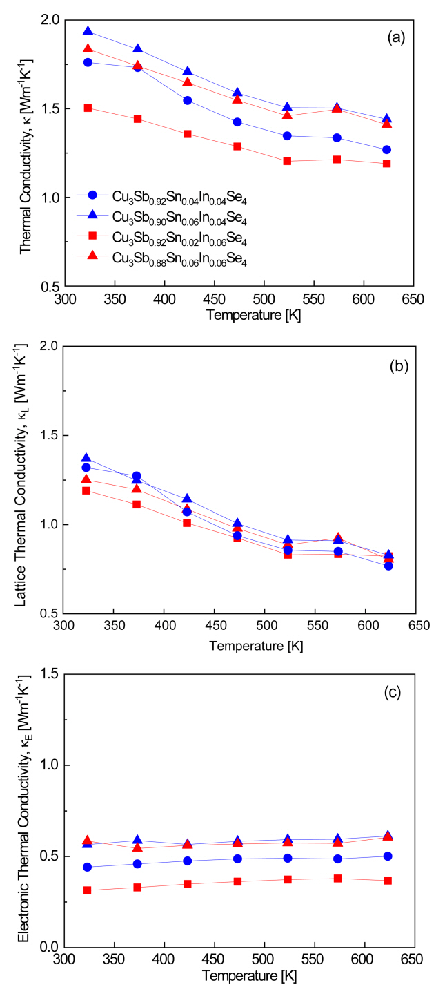 lattice thermal conductivity is dominant over the total thermal conductivity (Figure 6 (a)). Cu3Sb0.92Sn0.04In0.04Se4 exhibited a minimum кL of 0.77 Wm−1K−1 at 623 K. As shown in Figure 6(c), there is little temperature dependence for the electronic thermal conductivity,