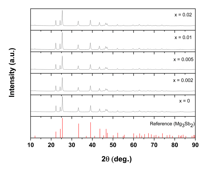 그림 1은 Mg3LaxSbBi 소결체의 XRD 패턴을 나타낸 그래프이다. 그림 1 하단의 Mg3Sb2의 표준패턴 (ICSD#165386)과 일치하며, Mg3Sb2 이외의 다른 2차상으로 의심되는 peak은 관찰되지 않았다.