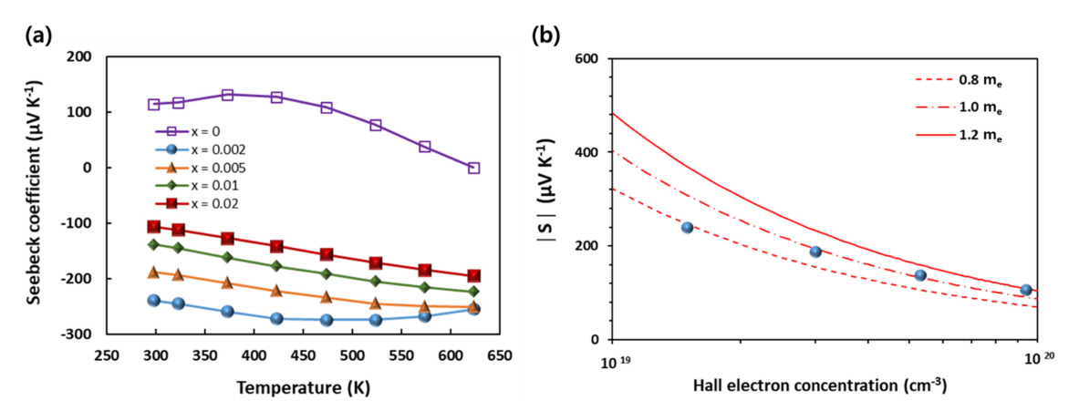 절대값은 감소함이 관찰된다. 이것은 기본적으로 제벡계수와 전하농도는 반비례 관계이기 때문이며, 식 (1)의 Pisarenko relation으로부터