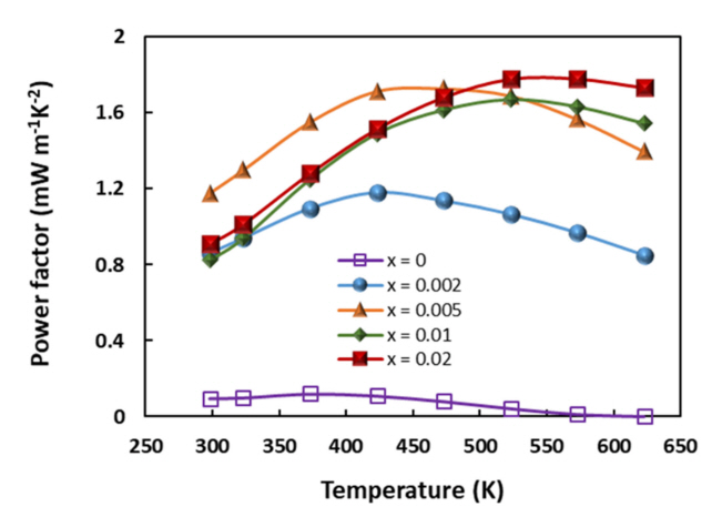 볼 수 있다. 파워팩터의 최대값은 x = 0.02인 샘플에서 얻어졌으며, 523 – 573 K 구간에서 약 1.8 mW m-1K-2였다.