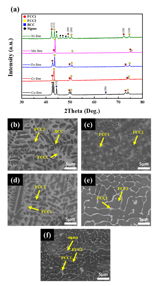 Fig 1는 CoCrFeMnNi 합금에 각 원소를 Cu로 대체하여 제조된 합금의 As-cast 상태에서의 XRD 결과 (a)와 미세조직 (b)-(e)이다.