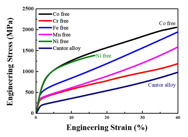 Co를 Cu로 대체하여 주조한 경우 두 개의 FCC와 한 개의 BCC가 나타났으며, 나머지 원소들의 경우는 두 개의 FCC상이 나타났다. Fig 2는 Cantor 합금을 포함하여 구성원소 중 한 원소를 Cu로 대체하여 주조한 직후 상온에서 압축시험 결과이다. 단상의 Cantor 합금보다 Cu로