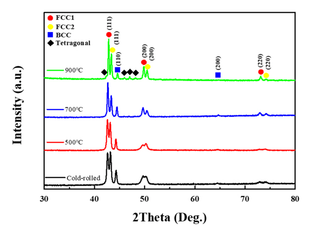 공통적으로 FCC1, FCC2, BCC 상이 포함되어 있으며 700°C 및 900°C에서 열처리 한 경우는 BCC의 피크가 감소하고 정방정계 (Tetragonal)의