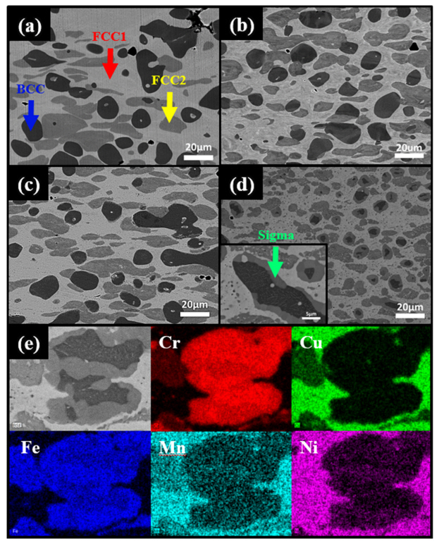 합금은 각각 시그마 상과 BCC상이 형성되었음을 볼 수 있다. Fig 1과 Fig 2에서 보는 바와같이 Ni과 Co를 Cu로 대체한 경우, 타 합금에 비해 기계적 물성이 증가하는 것을 보이고 있다. 이는 미세조직적 차이로 설명이 가능하다.