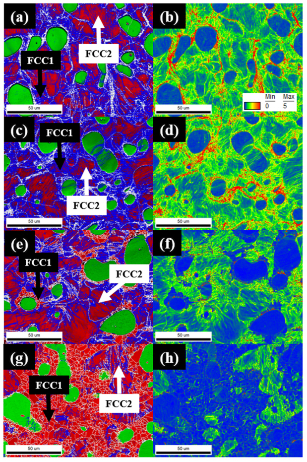 후방산란전자 회절 패턴 분석을 이용하여 결정립의 크기 및 방향, 전위밀도를 측정하였다. Fig 5는 합금의 열처리 온도에 따른 IQ (image quality) + phase map (a, c, e, g) 와 커널 평균 방위차 (kernel average