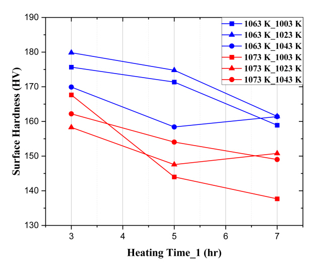 was 140 HV. For Intercritical annealing, the condition was the best when the 1st heating process was performed at 1073 K for 7 hours and the 2nd heating process was performed at 1003 K for 3 hours, and the surface hardness value